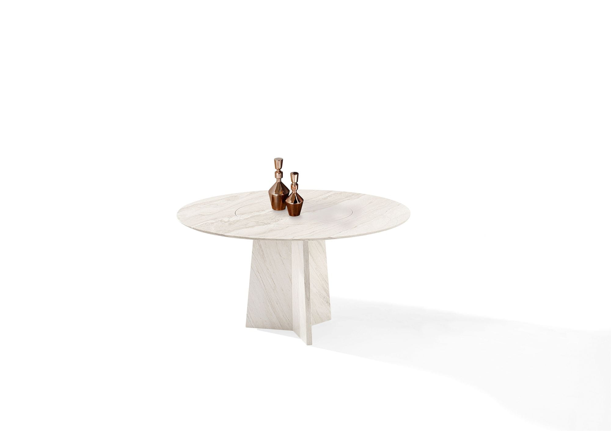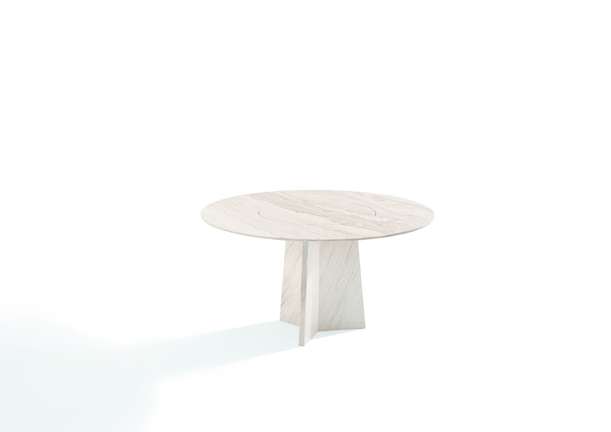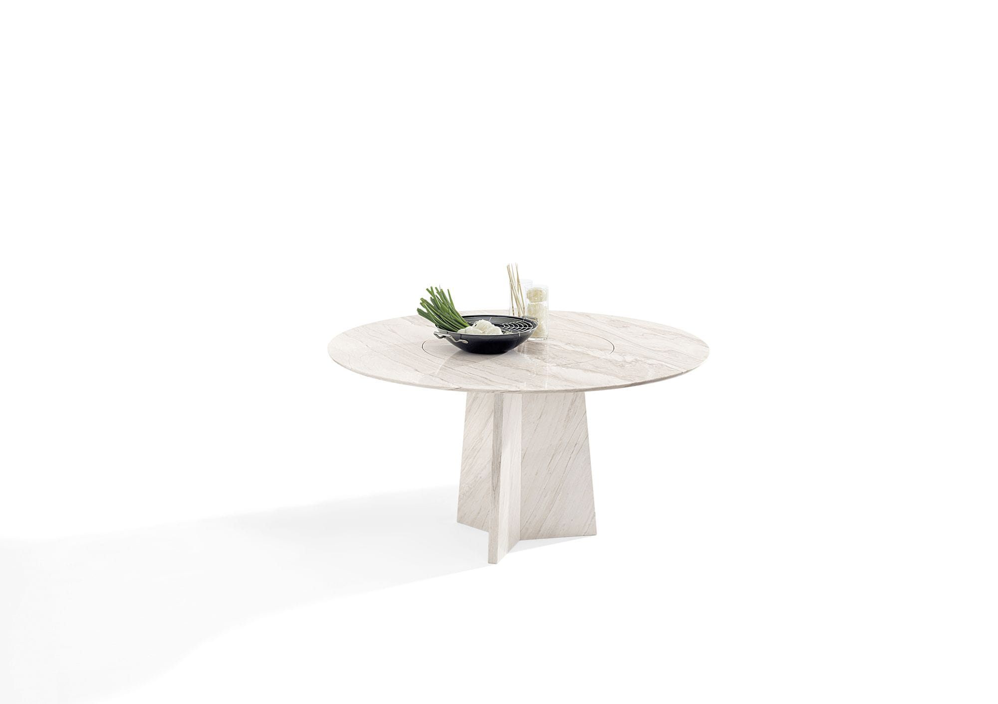 DRAENERT TADAO II ein runder Esstisch mit drehbarer Innenplatte. Das Besondere an diesem TADAO II Esstisch ist, dass die Drehplatte nicht aufgesetzt, sondern auf der Ebene der Hauptplatte integriert ist. Die Tischplatte sowie die Drehplatte werden aus einer einzigen Rohplatte gefertigt. Somit verläuft die Maserung des Steins über die gesamte Tischplatte. Dieser DRANERT TADAO II Naturstein Esstisch ruht auf einem sternförmiger Steinsockel als Unterbau.