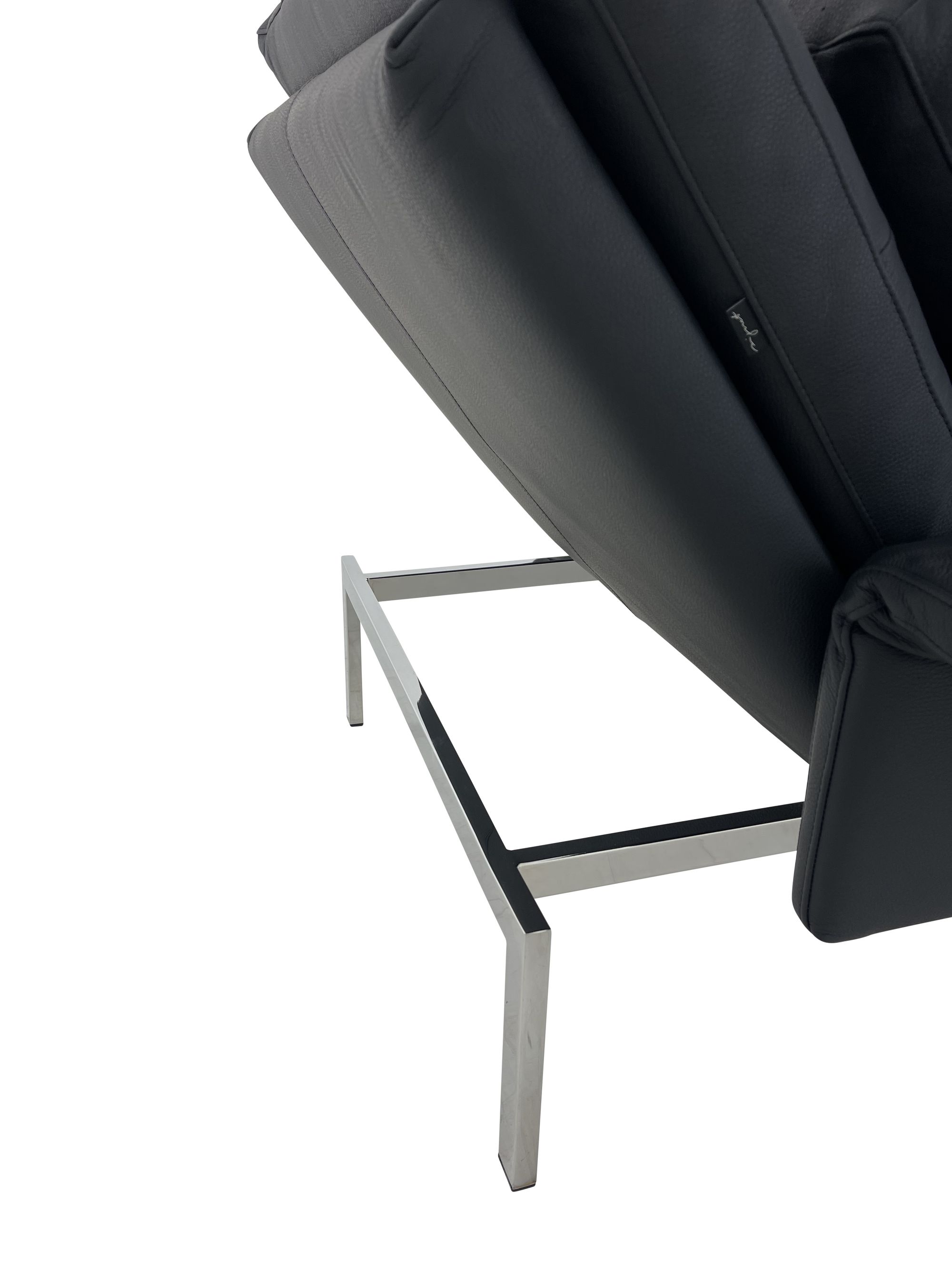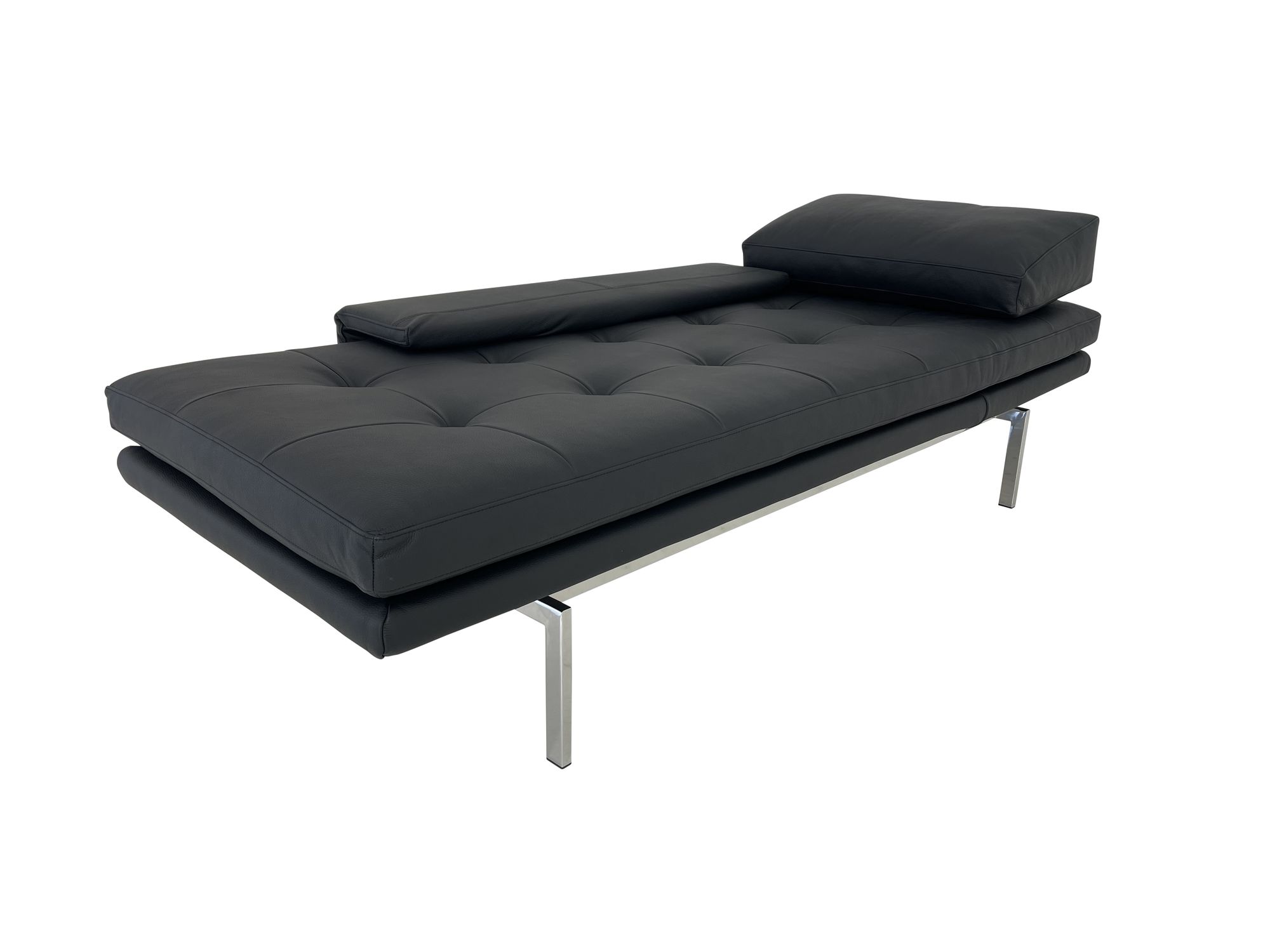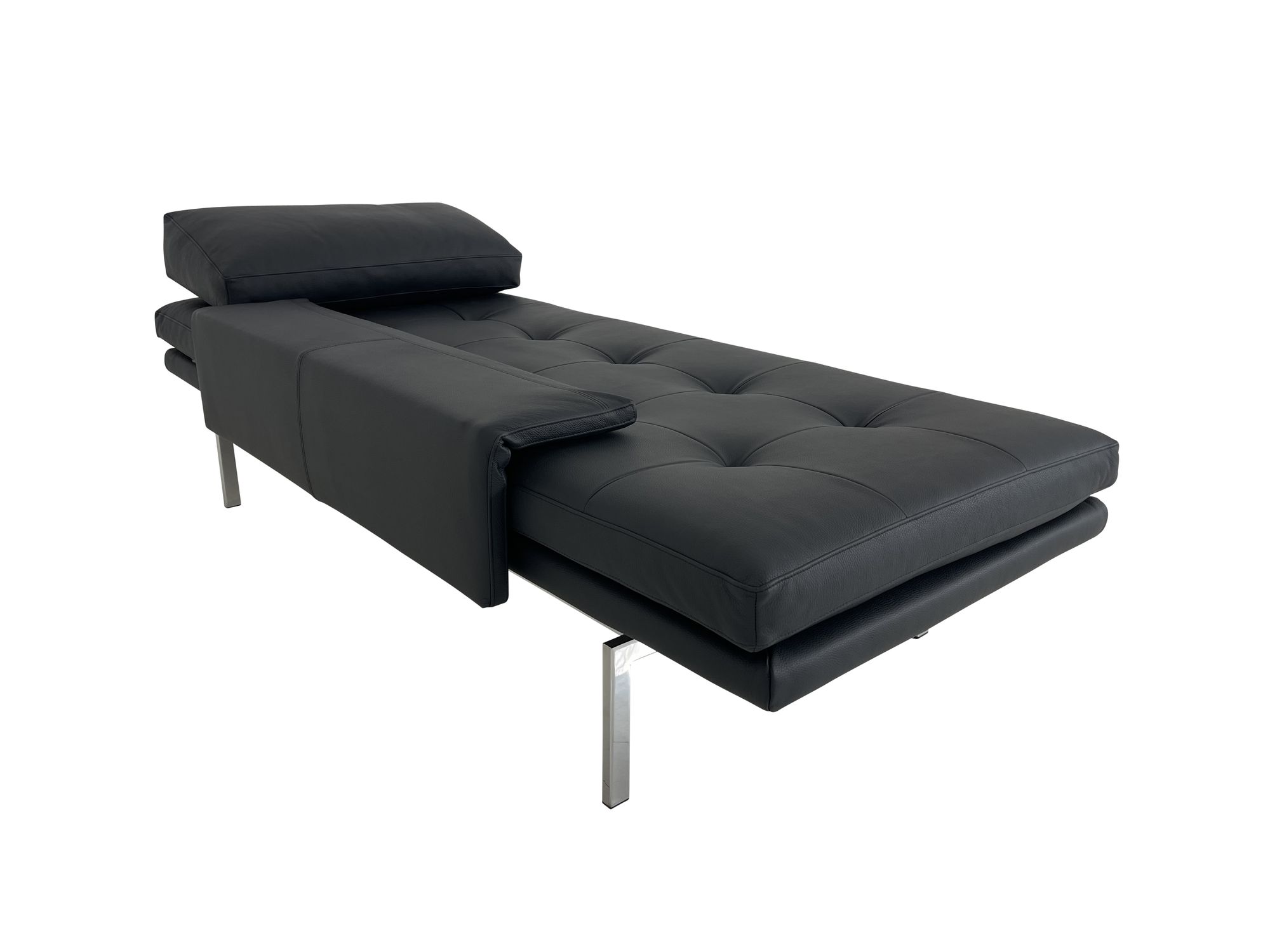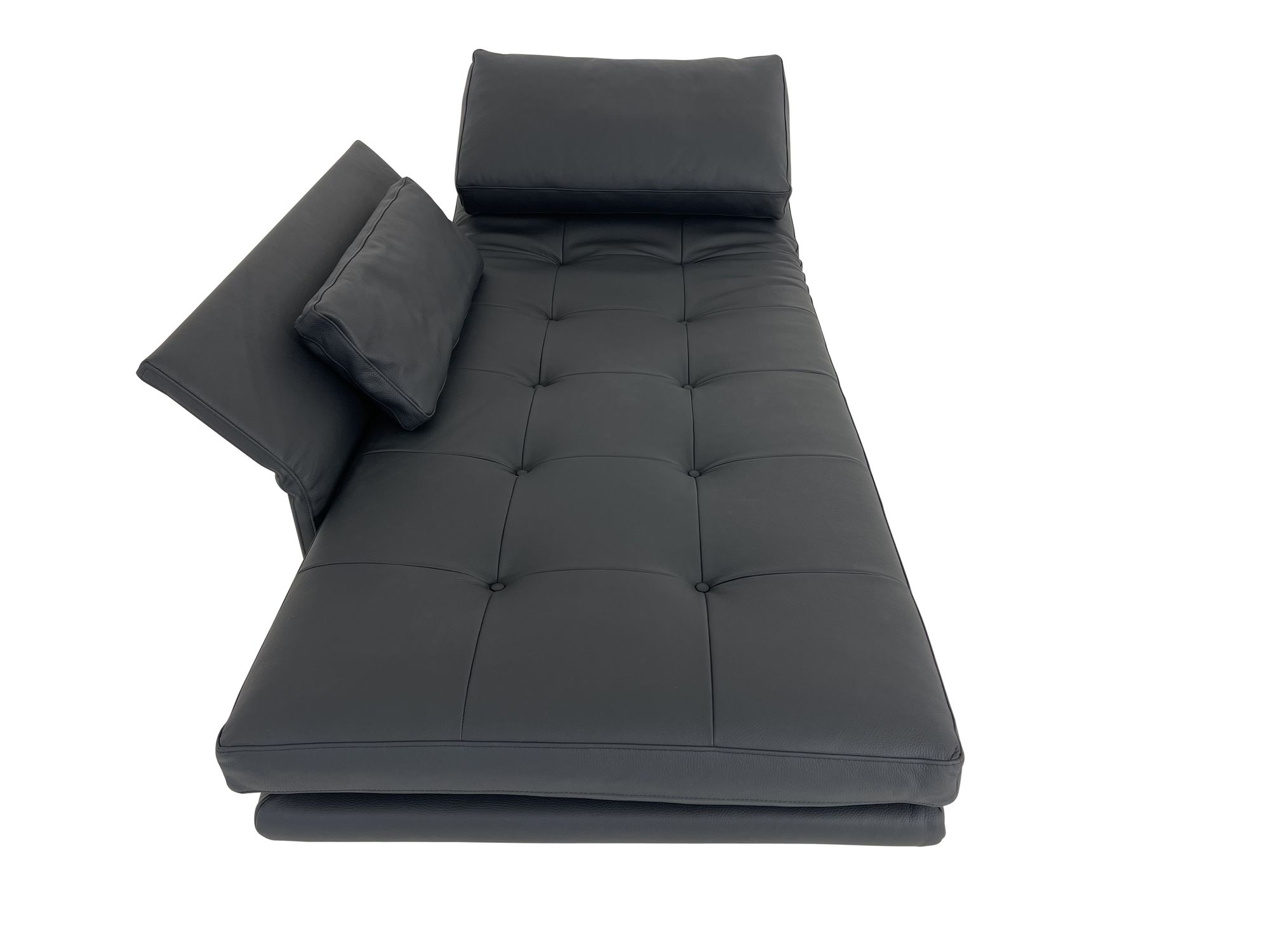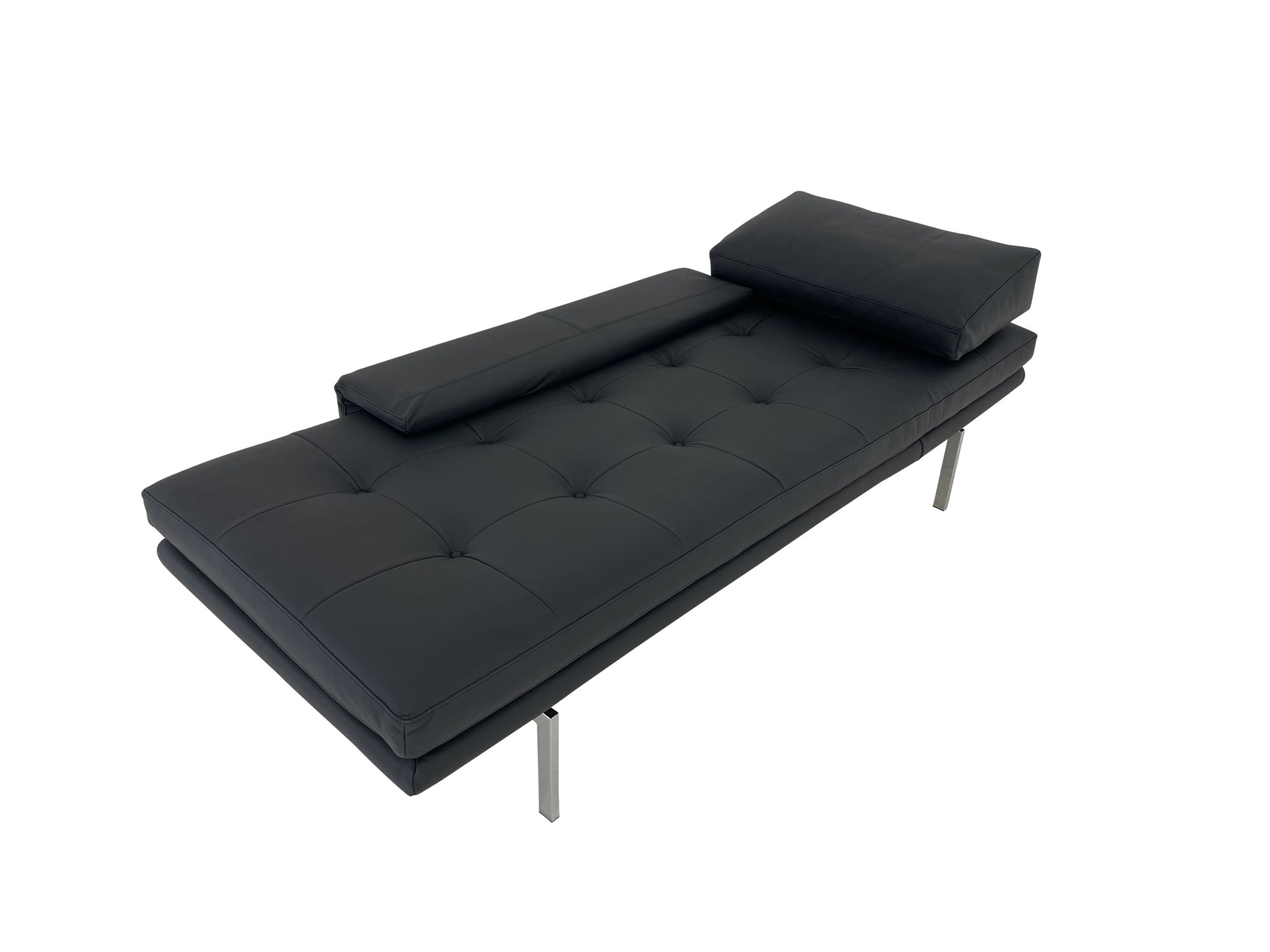 SIGNET FIDU Liege ist ein edles, zeitloses Schmuckstück: Hochwertige Materialität und Verarbeitung sowie elegantes, minimalistisches Design stehen beim vielseitigen SIGNET Daybed FIDU im Vordergrund. Der Komfort, sowohl beim Sitzen wie auch beim Liegen, ist herausragend. Kopf- und Seitenteil von FIDU sind verstellbar und das Seitenteil links oder rechts montierbar. Die beiden Kissen lassen sich nach dem individuellen Komfort zum Liegen und zum Sitzen in ihrer Grösse perfekt anpassen – dadurch ergibt sich eine ideale Sitz, Liege- und Schlaffläche mit edler Knopfsteppung auf edlen Leder Namibia schwarz.